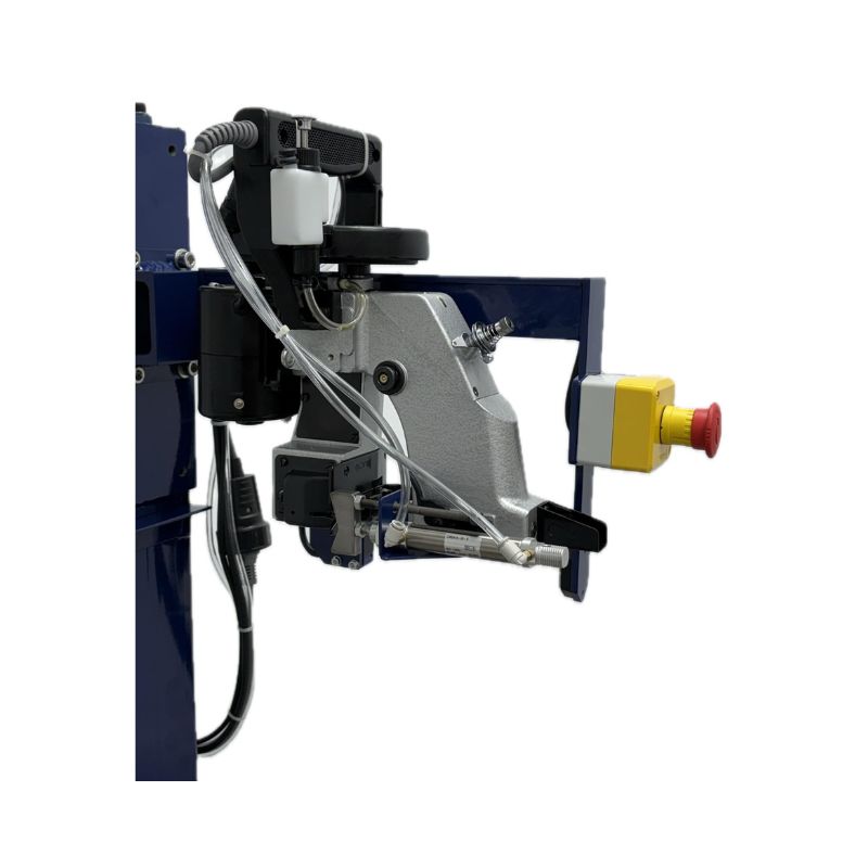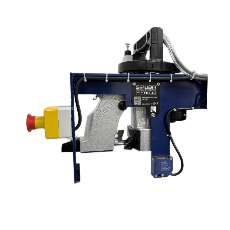El arranque y el paro son mediante una fotocélula que detecta el saco y pone en marcha la cosedora, una vez a pasado el saco la cosedora se detiene y activa el empujador para cortar la cadeneta.