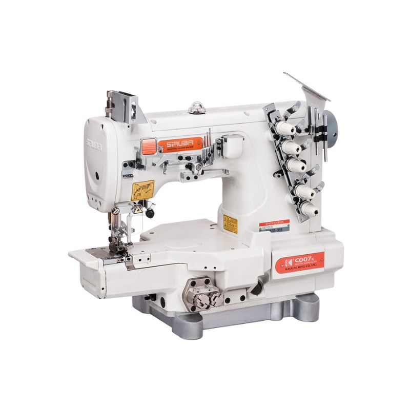 Cabezal recubridora industrial SIRUBA C007L de 5 hilos 3 agujas*. Distancia entre agujas de 5.6 mm o 6.4 mm y una longitud entre puntadas de 1,4 – 3,6 mm.